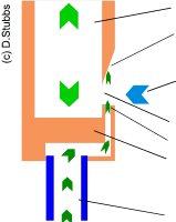 A: The air enters through the foot of the pipe and is directed towards the ‘Mouth’ and ‘Upper Lip’ via small jets in the ‘Lower Lip’. With no airflow, the pressure inside the pipe is equal to the outside atmospheric pressure. As the air passes over the mouth, it causes a pressure drop (moving air is at a lower pressure than stationary air), which forces a quantity of air inside the pipe to move towards the mouth. As the inside pressure falls, the outside air, which is at a relatively higher pressure, begins to push the air jets from the lower lip towards the inside of the pipe to equalize the reducing pressure. Eventually, the pressure is re-balanced and the airflow returns to the outside again. The cycle repeats continuously, causing the air column inside the pipe to oscillate.