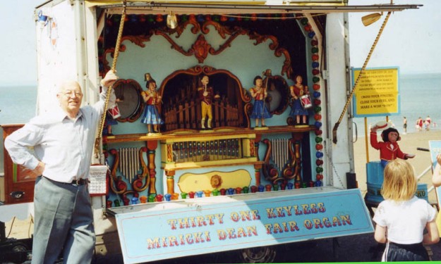Here is a picture of Stuart and the organ in happier times a few years ago when several organs were invited to play on Morecambe Promenade to entertain Visitors while at the Punch & Judy Annual Convention.